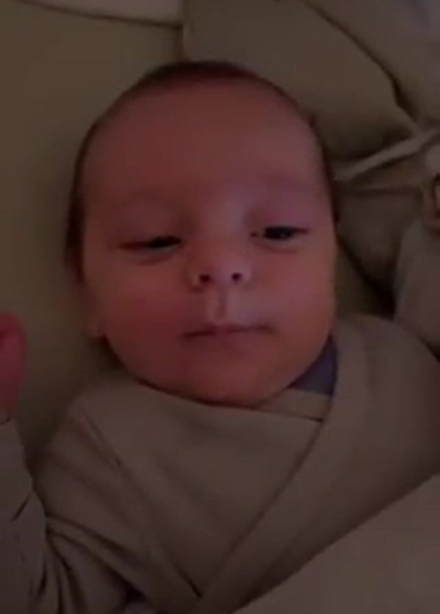 A close-up, top-down shot shows a baby lying on their back, swaddled in a light-colored blanket