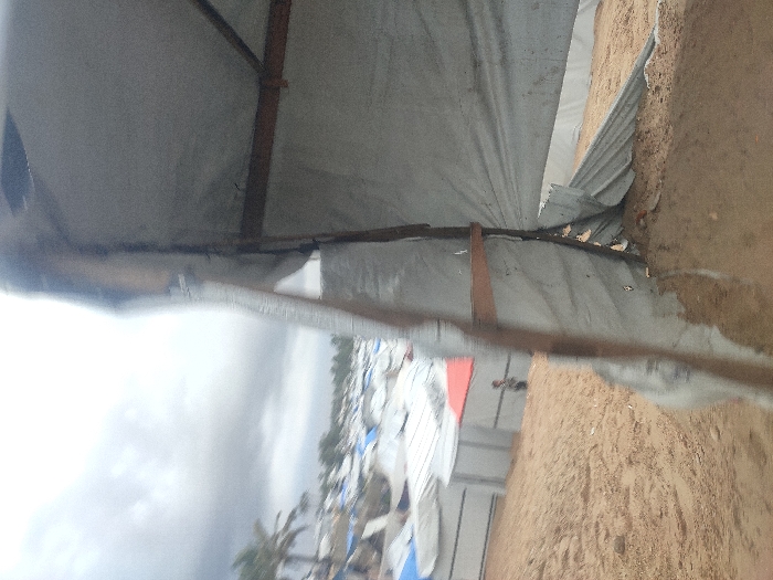 The image depicts a crowded makeshift settlement, identified as being in Al-Mawasi, Unknown. In the immediate foreground, to the right, is a partial view of a temporary structure constructed from grey tarp-like material stretched over wooden support beams. The tarp is tattered at the base and appears to rest on an earthen mound. The ground in the foreground consists of uneven, light brown sandy soil. In the mid-ground, a dense collection of numerous temporary shelters and tents extends across the landscape. These structures are predominantly white and light blue tarpaulins, with some featuring more rigid, possibly corrugated metal or plastic walls. One tent in the mid-left area has a distinct red-colored roof section. A single, small, indistinct human figure, possibly a child, is visible standing between two tents in the mid-ground. The background shows more of the expansive settlement under an overcast sky filled with dense grey clouds. Several palm trees are visible to the far left and in the distant background, interspersed among the shelters. The overall scene suggests a temporary encampment in an arid or semi-arid environment under cloudy conditions.