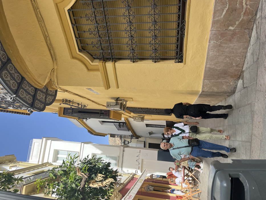 The image displays a narrow pedestrian street in Seville, Spain, identified as Calle Álvarez Quintero by a street sign "C. ALVAREZ" on a building. The scene is illuminated by bright daylight under a clear blue sky. On the right, a multi-story building painted bright yellow features an ornate wrought-iron balcony on an upper floor and a large ground-floor window secured with elaborate black wrought-iron grilles. Roller blinds are visible behind the grilles. The lower section of this building is clad in reddish-brown marble. An air conditioning unit is mounted on the yellow wall. On the left, a multi-story white building hosts an outdoor dining area under a partially visible red and white striped awning. Multiple individuals are seated at light-colored wooden tables with matching chairs. A green tree branch with foliage extends into the upper left quadrant. A sign reading "PLUNNL" is visible on the white building facade. In the mid-ground, three individuals are walking on the paved street. An older male with light grey hair, wearing a light green polo shirt, blue jeans, and a black shoulder bag, walks alongside an older female with short reddish-brown hair, wearing a white and green collared top, light green trousers, and sandals, also carrying a black shoulder bag. Slightly ahead of them, a third individual, with dark hair tied back and wearing a dark short-sleeved top and dark trousers (possibly a uniform with an apron), walks away from the viewer. Tattoos are visible on the third individual's left arm. A grey trash receptacle is partially visible in the lower left foreground.