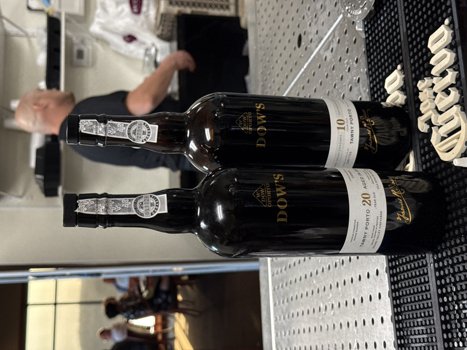 Two dark glass bottles of Dow's Oporto Tawny Porto are prominently displayed on a black rubber bar mat