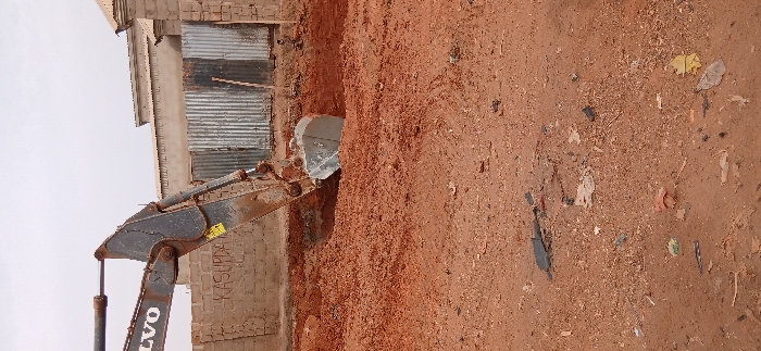 A Volvo excavator's arm and bucket are positioned in a reddish-brown dirt trench in Rigasa, Nigeria