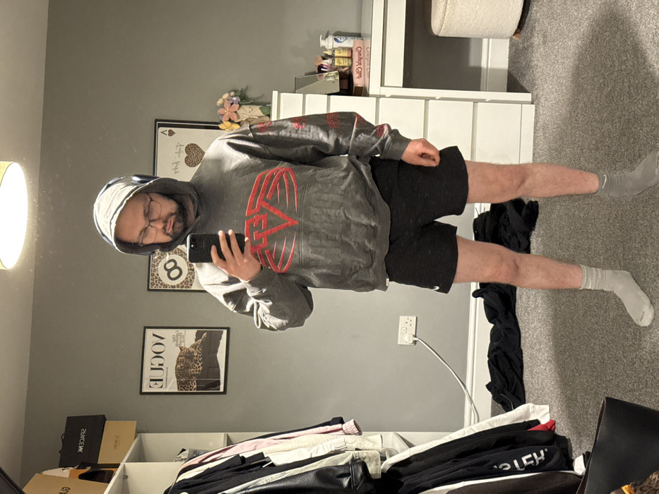 A male individual stands in an indoor residential setting, likely in the United Kingdom based on the visible Type G electrical outlet. He is seen from the chest up, capturing his reflection in a mirror. The male is Caucasian, with a beard and eyeglasses. He wears a grey hooded sweatshirt featuring a red, stylized logo on the chest, black athletic shorts with a white Nike swoosh on the left thigh, and light grey socks. He holds a black smartphone in his right hand, positioned to take a photograph. Over-ear headphones are visible beneath his pulled-up hood. His expression is neutral. The room features light grey walls and a dark grey carpeted floor. To the left, a white open shelving unit displays clothing and two shopping bags, one with "CHANEL" and another with "ZIMMI" (reversed). Three framed artworks are visible on the back wall: one depicting "VOGUE" with a leopard print, another with a large "8" on a leopard print background, and a third showing an ace of hearts with a leopard print heart (all reversed). To the right, a white vanity table or chest of drawers holds a decorative floral arrangement, several cosmetic bottles, and a small wooden box labeled "Crispin Court" (reversed). A light-colored, possibly upholstered, stool is partially visible to the far right. A white dual power outlet is mounted on the wall, with a white cable plugged in and trailing downwards. Dark clothing items are visible on the floor in the foreground.