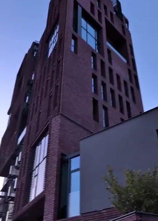 cityscape at dawn or dusk. It begins with a low-angle shot of a tall, modern building with a red-brick facade and large windows. The camera then pans to capture a broader view of the surrounding area. This includes older, blocky apartment buildings and a mountain range in the distance. Powerlines are visible, cutting across the clear sky. The sky is a gradient of light blue and hints of orange, suggesting the time of day. There is no people visible. The camera movement suggests it was filmed from a moving vehicle.