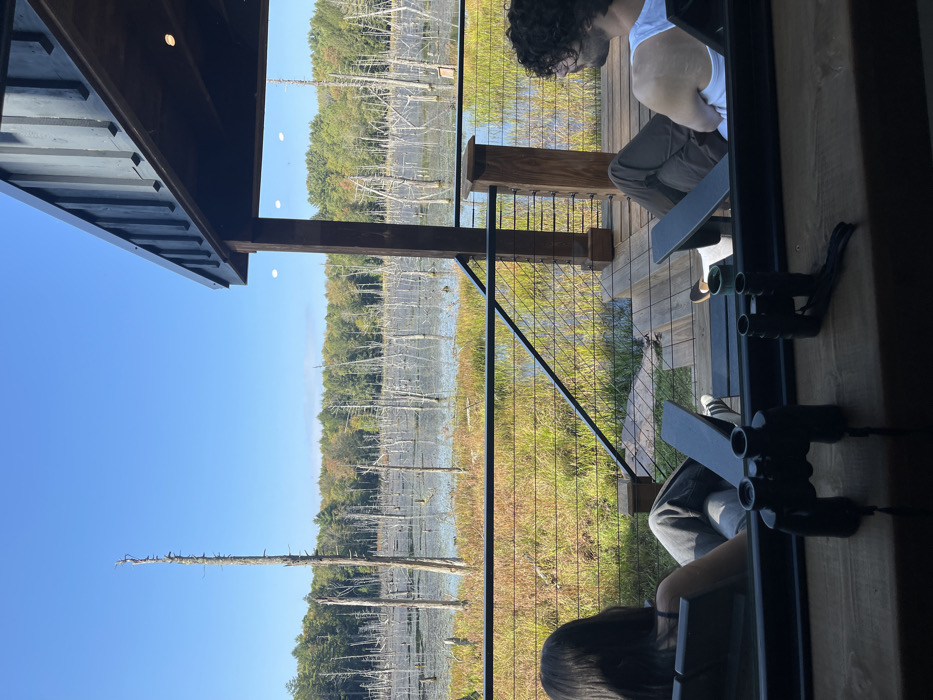 The image displays a panoramic view of a wetland ecosystem observed from a raised wooden deck structure in Otego, United States. The upper third of the frame shows a clear, light blue sky. Below this, a distant forest with green and some autumnal-colored foliage borders a large body of water. This water is densely populated with numerous light-colored, bare, dead tree trunks (snags) protruding vertically. The immediate foreground features a dark wooden deck with a multi-strand horizontal cable railing system and a dark structural column. Two individuals are seated in dark outdoor chairs on this deck, oriented towards the wetland. The person on the left has long dark hair, wears a dark top and light trousers, and has their legs crossed. The person on the right has dark curly hair, wears a white tank top and dark trousers. Both are positioned with their backs partially or fully to the viewer, appearing to observe the scene. On a dark wooden ledge in the closest foreground, two pairs of black binoculars are present.