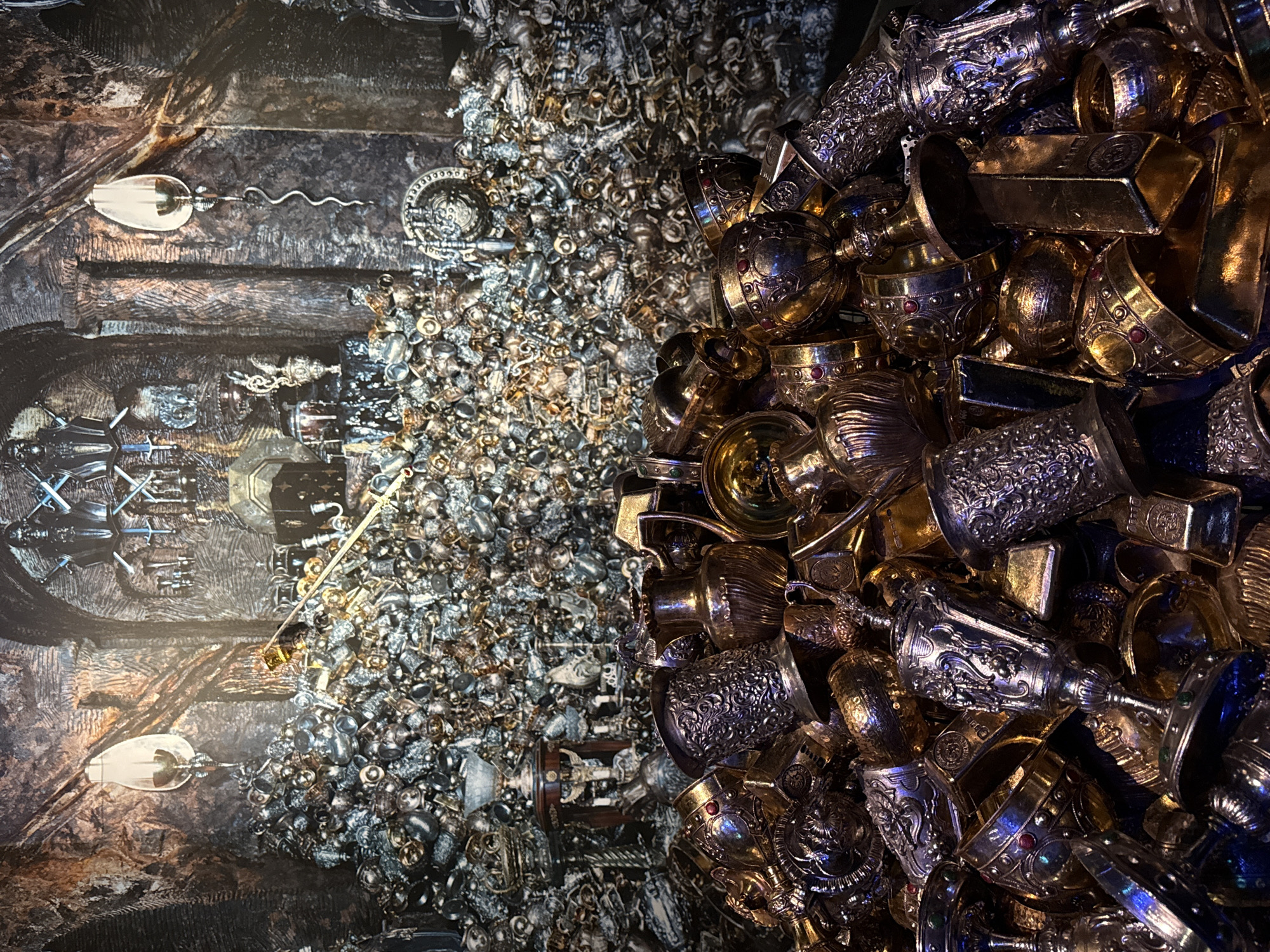 The scene depicts an indoor exhibit at the Warner Bros. Studio Tour London – The Making of Harry Potter, located in Leavesden, Watford, within the Three Rivers district, United Kingdom. The foreground displays a substantial, disorganized pile of numerous ornate metallic artifacts. These include an assortment of goblets, chalices, tankards, pitchers, and rectangular bars resembling gold bullion. The items exhibit varied metallic finishes, predominantly gold, silver, and bronze hues, and feature intricate embossed designs; some pieces are embellished with small, round, simulated red or green gems. The background consists of a large-scale set piece or mural illustrating a vast, dimly lit stone vault or cavern. This depicted environment features textured stone walls and prominent arched architectural elements. Within this backdrop, an expansive hoard of countless metallic objects, visually consistent with those in the foreground, extends into the perceived distance. Two ornate wall sconces, each with an elongated, teardrop-shaped opaque glass diffuser, are mounted on the simulated stone walls, one on the left and one on the right, emitting a soft internal light. A dark, complex metallic fixture, suggestive of a weapon display with crossed swords and a shield-like element, is affixed to the upper center of the background wall. No individuals, actions, or interactions are present in the image.