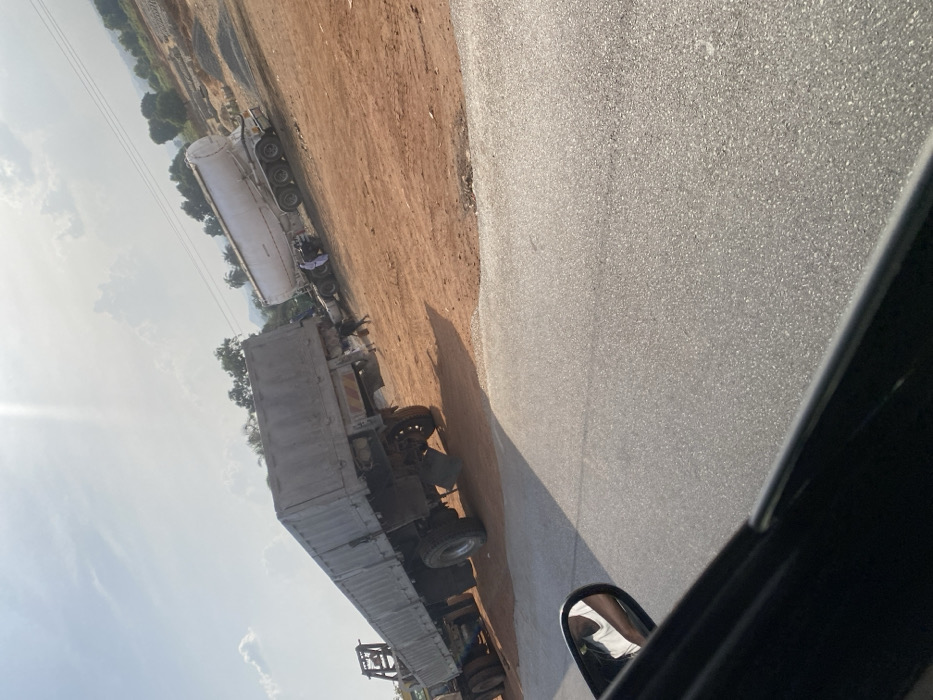 An outdoor shot taken from a vehicle shows a gray asphalt road on the right. The left side features a dirt patch with two long trailers parked. One trailer is white and cylindrical, likely a tanker. The other is box-shaped and gray. Trees are visible in the background on the left. A side mirror and part of the car's interior appear in the lower right corner. The sky is partially visible above the trailers.