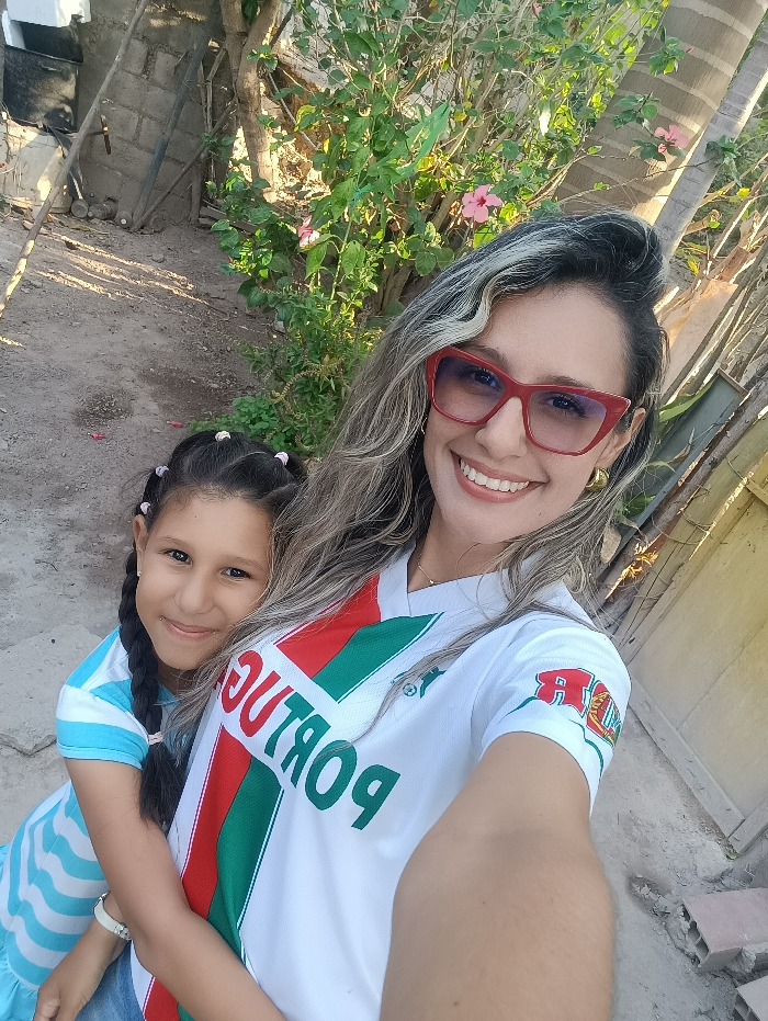 This image captures an outdoor scene in Sabaneta, Venezuela, featuring two smiling females: an adult and a young girl. The adult female, positioned in the foreground and appearing to be taking a selfie, has long, wavy hair with blonde highlights, wears red cat-eye sunglasses with tinted lenses, and a white short-sleeved t-shirt bearing a vertical red and green stripe with the mirrored word "PORTUGAL" in green text. She also wears small gold hoop earrings. Behind and to her left, a young girl with dark hair styled in two braids with colorful ties is seen embracing the adult from the side, her left arm around the adult's waist. The girl wears a light blue and white striped short-sleeved top and a white bracelet on her left wrist. Both individuals are looking towards the camera with broad smiles. The background includes dense green vegetation with several pink hibiscus flowers and a visible tree trunk. To the upper left, a partially obscured concrete block wall is visible with poles leaning against it. The ground appears to be bare earth.