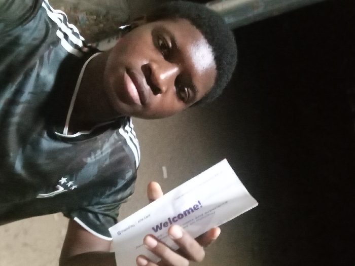 A selfie shows a young man wearing a black soccer jersey with white stripes and stars on the shoulder. He holds a white envelope with "Welcome!" printed on it. The background appears to be dark, possibly outdoors at night. The man is looking directly at the camera with a slightly tilted head. His complexion is dark, and his hair is short. The lighting is uneven, with shadows across his face and the envelope.