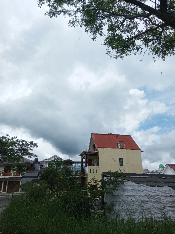 The image depicts a residential area in Ganja City, Azerbaijan, under a partly cloudy sky. The foreground features tall, wild green grass and some low-lying dark green foliage. In the midground, a prominent two-story building with light yellow stucco walls and a steep, red-orange gabled roof is visible. This building has a dark-paned rectangular window on its front face and a balcony with dark railings and a glass barrier extending from its left side. A silver cylindrical object, possibly a ventilation or plumbing fixture, protrudes from the red roof. Adjacent to and slightly in front of this building, a low structure is partially covered by a wrinkled grey tarpaulin. Behind these structures, a cluster of other residential buildings with varied rooflines and colors (grey, white) can be seen, some featuring glass terraces or balconies. A paved or unpaved road segment is partially visible on the lower left. The background reveals a distant building with a distinctive bright green dome, likely a mosque or religious structure. The sky occupies the upper two-thirds of the image, displaying a mix of dense, dark grey storm clouds and patches of clear blue sky with white cumulus clouds, particularly towards the right. The upper edge of the frame is bordered by the dark green leaves and branches of a large tree. No individuals or discernible actions are present.