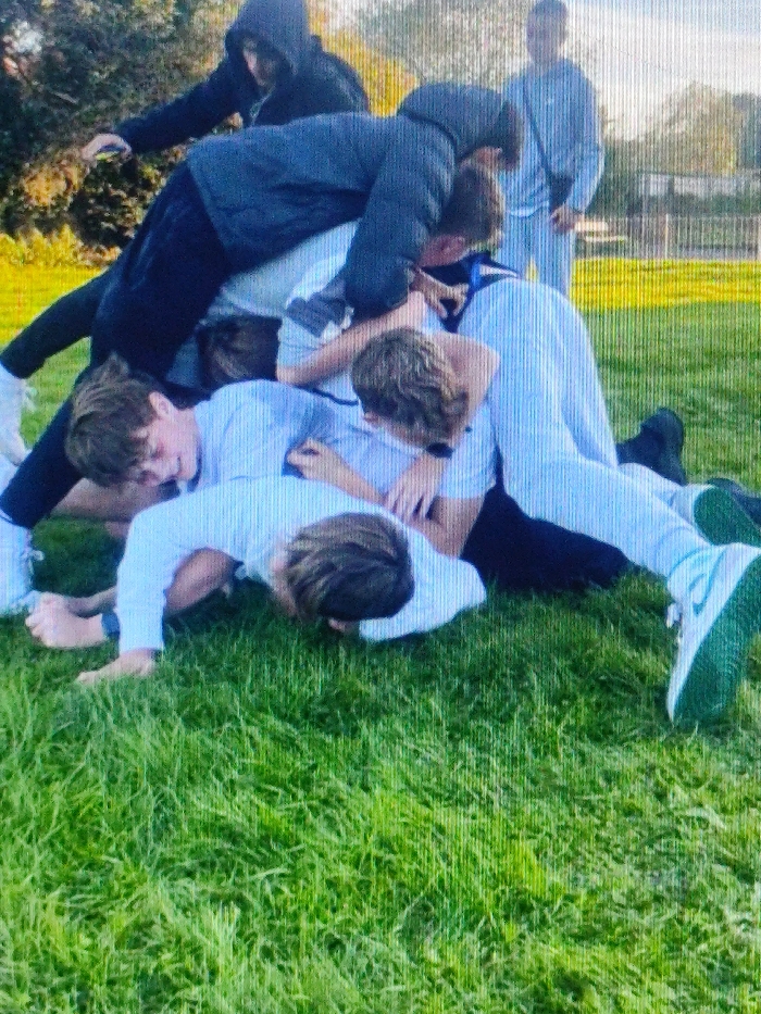 An outdoor scene depicts approximately eight young individuals engaged in a recreational "dogpile" on a green grassy field
