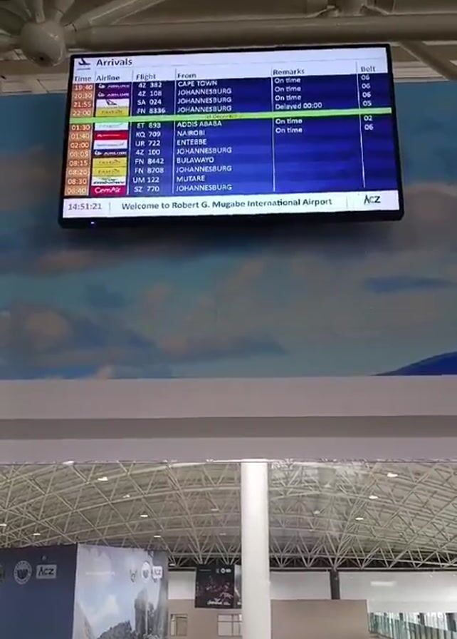 digital arrivals board at Robert G. Mugabe International Airport. The screen displays flight information, including the time, airline, flight number, origin city, remarks, and belt number. In the foreground, there is a multi-level airport interior with white columns, exposed ductwork, and wall murals of mountains. The camera is static.