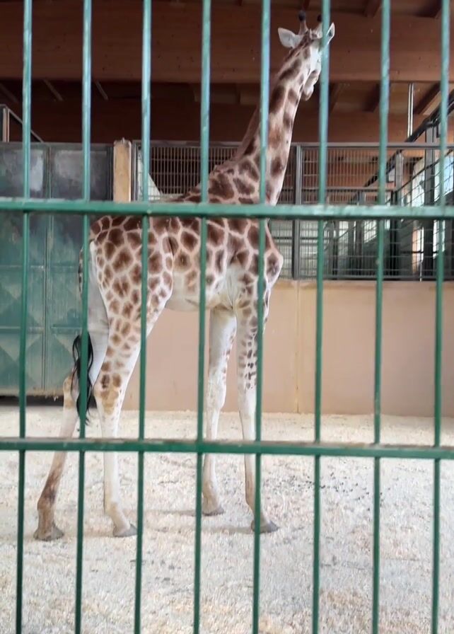 - "A giraffe stands inside an enclosure with light-colored wood shavings covering the ground" by FM-SHEMl1, licensed under CC BY 4.0
