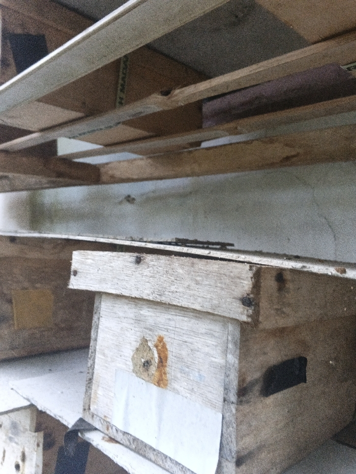 The image presents a close-up, upward-angled view of a structured environment, likely indoors or under a canopy. The upper third of the frame reveals an overhead assembly of aged wooden planks and beams, some exhibiting natural grain variations and others showing lighter, more uniform tones. A segment of a green label, partially reading "MADA", is affixed to one horizontal plank. Beneath this overhead structure, a light-colored wall with visible cracks and minor discolorations forms the background. The lower two-thirds of the image focus on multiple weathered wooden boxes, arranged in a stacked or tiered configuration. The most prominent box, centrally positioned, is constructed from light-colored wooden planks fastened with visible nails. Its front surface features a roughly circular opening surrounded by an irregular, orange-brown residue, below which a rectangular piece of white material is attached. A dark, rectangular opening is cut into the right side of this box. Additional wooden boxes, some displaying yellow or light-colored rectangular patches, are partially visible behind and below the central box. No individuals, explicit actions, or interactions are visible. The specific location within Kon Tum, Vietnam, is not discernible from the visual evidence.