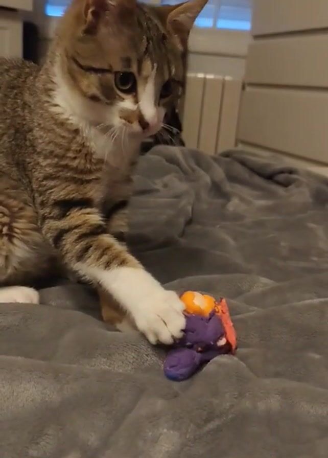 A tabby cat plays with a clay object on a gray blanket. The cat is mostly striped and has white paws. The clay object is colorful, made up of purple, orange and red. A hand with fingernails is shown briefly, touching the clay object. The environment is a bedroom; one sees a window, a radiator, and white furniture in the background.