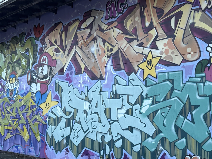 A concrete wall, located under a bridge or overpass in Vaasa, Finland, is entirely covered with multi-layered graffiti. The dark, concrete underside of the overhead structure is visible along the top edge of the image. The wall features various distinct graffiti pieces. On the far left, a section of green and yellow wildstyle lettering is present, beneath which a blue, robot-like character with white and red details is depicted. A red tulip graphic is painted directly above this section. Adjacent to the left, the character Mario, wearing a red cap, red shirt, and blue overalls, is shown facing left, holding a small megaphone-like object to his mouth. A yellow star character with a smiling face is positioned below Mario. The upper-middle and right sections of the wall are covered by complex, stylized lettering in shades of brown, beige, orange, and purple, incorporating sparkle effects and abstract shapes. A second yellow smiling star character is centrally positioned within this brown/orange section. The lower-middle and right portions of the wall display intricate block-style graffiti in light blue and teal hues, characterized by sharp angles, drop shadows, and layered forms. The background visible between and behind the graffiti elements is a light purple, patterned with scattered white stars and dots.