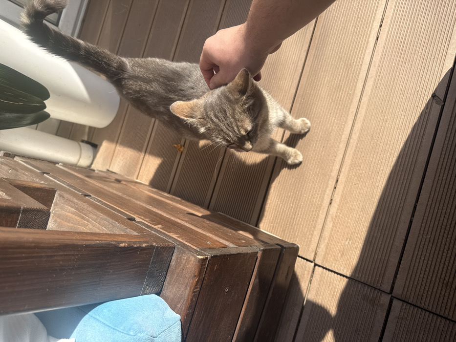 The scene captures an outdoor balcony or patio located within the city of Blagoevgrad, Bulgaria, illuminated by strong, direct sunlight from the right, casting elongated shadows towards the left. The flooring consists of light brown composite decking tiles arranged in a grid pattern. In the foreground, a domestic short-haired tabby cat, primarily grey-brown with lighter undersides, stands on all four paws, facing towards the left side of the frame with its head slightly turned. Its eyes are partially closed, and its tail is raised and slightly curled at the tip. A Caucasian right hand, with visible knuckles, is gently touching the cat's head near its left ear, indicating an interaction of petting or stroking. To the left of the cat, a dark brown, multi-tiered wooden structure, exhibiting wear and visible grain, occupies the left side of the frame. This structure appears to be part of an outdoor furniture piece, potentially a planter box or shelving unit. A light blue fabric or cushion is partially visible resting on or beside the wooden structure. In the background, to the upper right of the wooden structure, a white cylindrical planter containing a plant with dark green leaves is visible, alongside a thin, white vertical pipe. Small, light brown organic debris, resembling dry leaves, is scattered on the decking near the wooden structure.