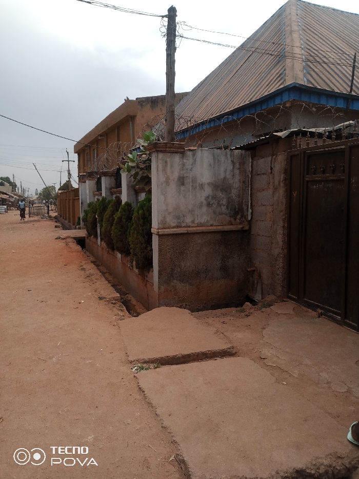 A low-angle shot depicts a dirt road alongside a walled property. A man walks in the distance on the left. The property features a corrugated metal roof with a blue trim, and the walls are topped with barbed wire. Trees are planted along the base of the wall. Concrete blocks create a walkway from the road to the building. The image is taken under a cloudy sky. A wooden utility pole rises in front of the building. The bottom left corner shows a "TECNO POVA" watermark.