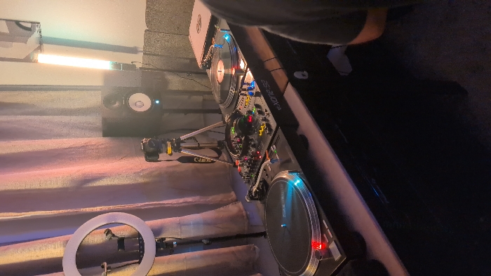 - "A DJ setup featuring two turntables, a mixer, and a light ring is arranged in a room" by FM-AbQI73, licensed under CC BY 4.0