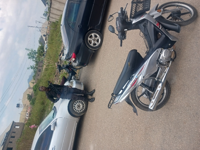 An adult male stands in a paved outdoor area within Nagazi, Nigeria. He wears a dark, long-sleeved tactical-style shirt, dark cargo pants, and dark combat boots, holding a dark-colored rifle across his chest with the barrel pointing left. His left hand rests on his hip. To his left, a silver four-door sedan is partially visible, parked facing right. To his right, a black four-door sedan is parked, also facing right. A dark-colored motorcycle is parked between the two sedans, behind the man. In the immediate foreground, a silver and black scooter-style motorcycle with a front basket and a rear rack is parked on the asphalt, facing right. The background features an overgrown, grassy area with scattered refuse, utility poles, and several distant residential or commercial buildings, some appearing unfinished, under a partly cloudy sky. A water tank on a stand is visible on a rooftop in the background, with hills or mountains on the horizon.