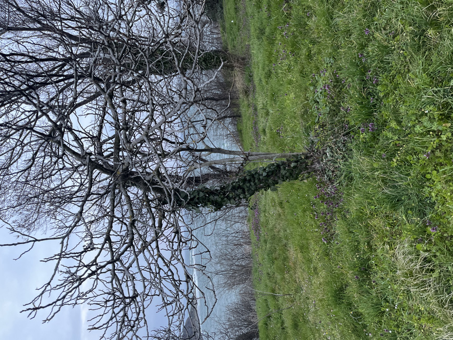 The image depicts a coastal hillside scene in Tsarevo, Bulgaria, under an overcast sky. The foreground and midground are dominated by a sloping patch of lush green grass, interspersed with numerous small purple flowers. Several deciduous trees, bare of leaves, are present, with their intricate branch networks silhouetted against the sky. The most prominent tree, situated slightly left of center, has its trunk partially covered in dark green ivy. In the background, a body of water, consistent with the Black Sea, displays a light blue-green color with visible whitecaps. A distant landmass is visible on the far left horizon. No individuals or man-made structures are observed within the frame.
