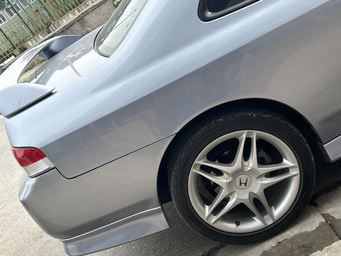 The image captures the rear-right quarter view of a light grey metallic two-door Honda Prelude coupe, situated in Veliko Tarnovo, Bulgaria
