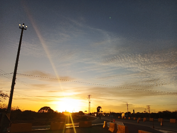 This image captures a wide-angle view of a roadside scene in El Dátil, Venezuela, at sunrise or sunset. The sky transitions from deep blue overhead to vibrant orange and yellow at the horizon, marked by patterned altocumulus clouds. A prominent solar disc, intensely bright and causing significant lens flare, is positioned low on the horizon slightly to the left of the center. In the left foreground, a tall, dark utility pole with three illuminated lights at its apex stands vertically. Multiple horizontal power lines extend from this pole across the frame. The immediate foreground features a paved roadway, slightly curving to the right, bordered on both sides by numerous orange concrete barriers, indicating ongoing construction or traffic management. Several orange traffic cones are also visible on the road surface. Further down the road, additional utility poles with crossarms and wires are silhouetted against the bright sky. The midground and background consist of a line of dark, silhouetted trees and vegetation. Distant structures are faintly visible beyond the trees. Several vehicles, appearing as dark silhouettes, are present on the road in the distance, suggesting traffic movement. No individuals are clearly discernible. The overall lighting conditions are characterized by strong backlighting from the low sun, creating long shadows and intense glare.
