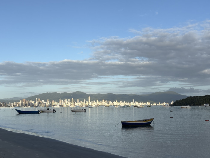 The image displays a coastal scene captured from Porto Belo, Brazil, looking across a body of water towards a distant city skyline and mountains