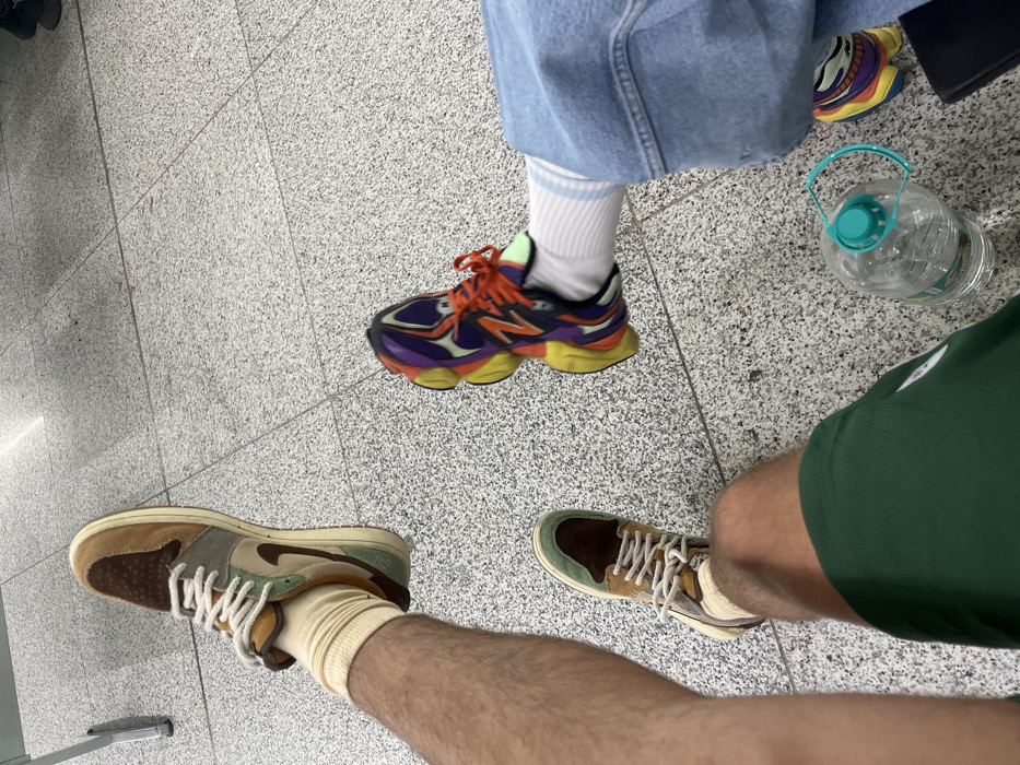- "This image captures an overhead perspective of the lower extremities of two individuals seated indoors on a light grey, speckled tiled floor, consistent with public waiting areas such as an airport terminal or metro station within the city of New Delhi, India" by FM-fZXFa2, licensed under CC BY 4.0