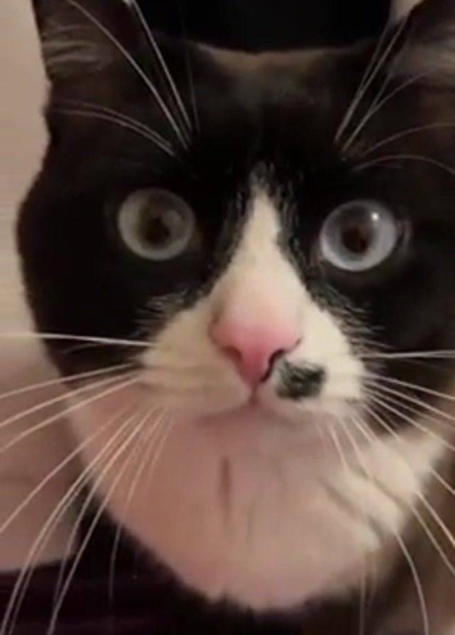 close-up of a cat with black and white fur, light blue eyes, and a pink nose
