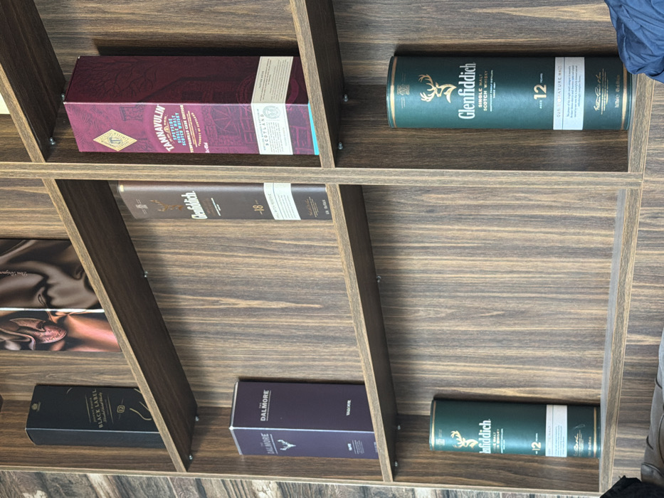 The scene is an interior view within the city of Lyuben Karavelovo, Bulgaria, depicting a dark brown wooden shelving unit. The unit features a visible vertical wood grain and is divided into multiple compartments by horizontal shelves and vertical partitions, secured with visible metal fasteners. Displayed within these compartments are various whisky containers. On the top shelf, from left to right, are a rectangular black box labeled "BLACK LABEL", a tall, slender brown rectangular box marked "Glenfiddich -18- SINGLE MALT SCOTCH WHISKY" with a deer emblem, and a tall, slender maroon rectangular box labeled "TANNABULIN SPEYSIDE SINGLE MALT SCOTCH WHISKY - TEMPRANILLO CASK EDITION" with a 'T' emblem. On the middle shelf, a dark purple rectangular box labeled "DALMORE" with a stag emblem is positioned in the left compartment. On the bottom shelf, two cylindrical dark green tins, each labeled "Glenfiddich -12- SINGLE MALT SCOTCH WHISKY" with a deer emblem, are present in the left and right compartments, respectively. The background to the left of the shelving unit shows a lighter, textured wall surface. A dark blue fabric object is partially visible in the bottom right foreground. No individuals, actions, or interactions are present in the frame.