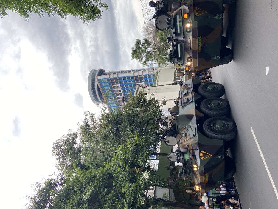 The image depicts two Indonesian Pindad Anoa-2 8x8 armored personnel carriers (APCs) moving along a city street in Surabaya, Indonesia