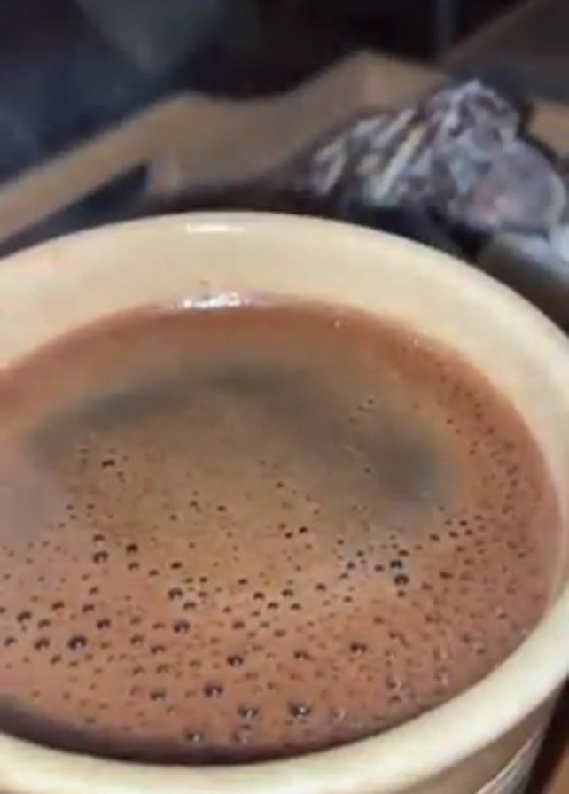 A close-up shot focuses on a cup of dark brown coffee, steaming slightly. The cup is a light, creamy brown color with a textured or decorated exterior. In the blurred background, there is a wooden tray or surface with some unidentified objects, possibly stones or bones, covered in what appears to be a powdery substance. The lighting is soft, creating a warm and inviting feel.