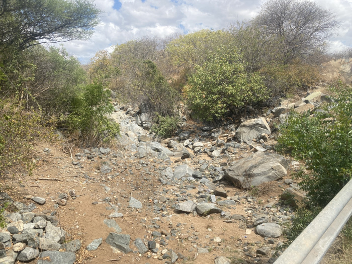 dry riverbed in Mbweleli, Tanzania, located at latitude -7.125 and longitude 35.949. The riverbed is filled with rocks of various sizes and a small amount of dirt. There are trees and shrubs on both sides of the riverbed. The ground is dry and dusty. The image appears to be taken from the side of a road with a guard rail in the foreground. The area is likely a rural or semi-rural area.