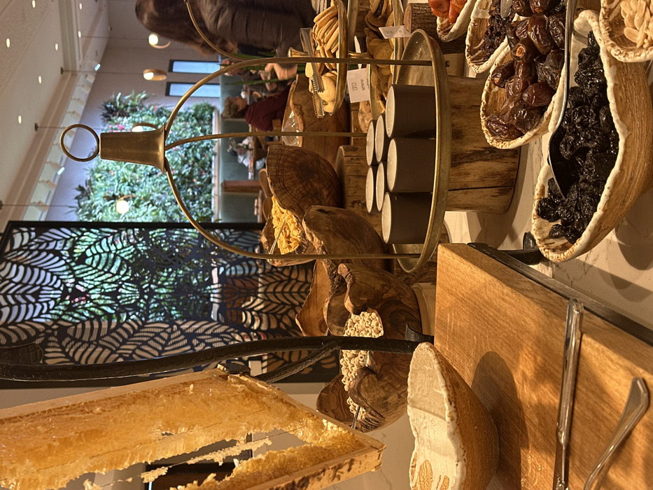 A tiered serving tray holds an assortment of edibles, including honeycomb, nuts, dates, and prunes in natural, textured bowls