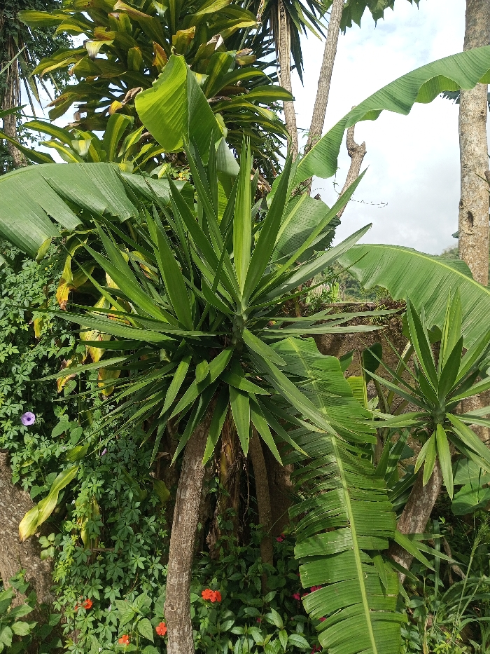 Lush vegetation scene: spiky yucca-like plant with long, green leaves dominates the center