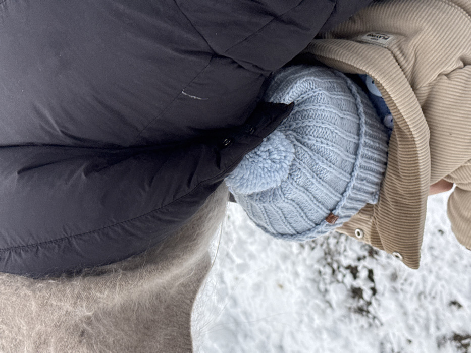 A wintery snapshot from above reveals a collection of textures and garments. A black puffer jacket presses against a light beige, fuzzy sweater. Nestled between them, a light blue knit hat with a pom-pom sits alongside a tan corduroy jacket. The ground is covered in snow, adding to the cold-weather scene.