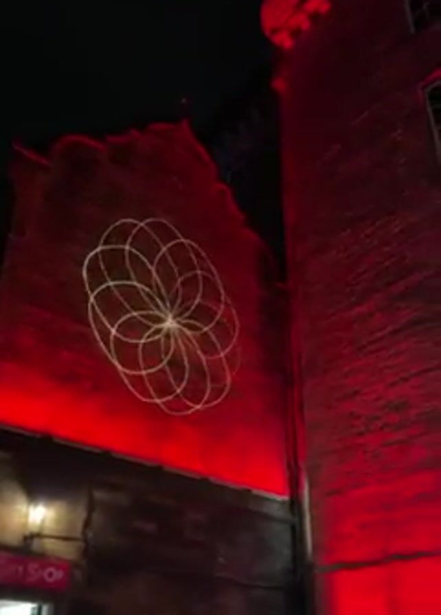 At night, two brick buildings are brightly illuminated in red. On the face of the building to the left, a white geometric design has been projected. There is a gift shop visible near the bottom of the frame. To the right, the other building is taller, with windows. Part of the Royal Mile is visible to the right of that building.