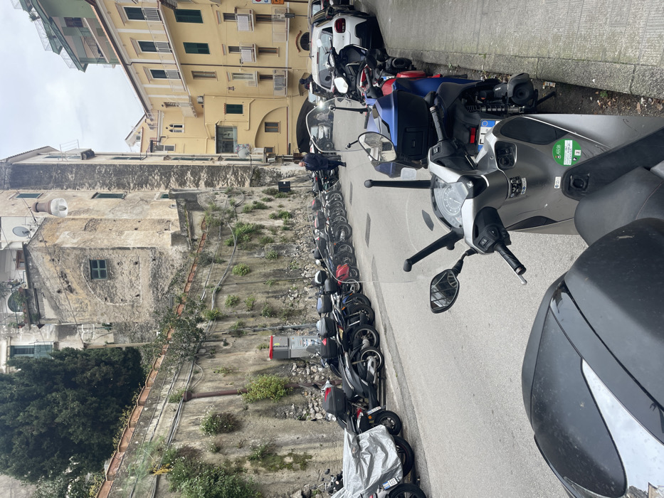 The image depicts a street scene in Pogerola, Italy, under an overcast sky. In the immediate foreground, the handlebars, windscreen, and front cowl of a silver-colored scooter are visible, parked on the right side of the street. The scooter displays an Italian license plate and a green sticker. Adjacent to it on the right are parts of other parked scooters and motorcycles. The street, paved with asphalt, extends into the mid-ground, where a long line of approximately fifteen to twenty scooters and motorcycles are parked in a single file along the left curb. One scooter in this line is partially covered by a grey tarp. To the left of the parked scooters, a tall, weathered concrete or stone retaining wall rises, supporting an elevated terrace with visible potted plants and some green vegetation. Above this wall, an old, multi-story building with a crumbling stone facade and small, green-framed windows is visible, partially obscured by a dark green conifer tree. In the mid-ground, further down the street on the right, several white cars are parked along the curb, including a Citroën C3 Aircross. One individual, seen from behind, walks away from the viewer on the street between the parked vehicles and the buildings. This person is wearing a dark coat. The background features tightly packed multi-story buildings. On the right, structures primarily painted light yellow feature numerous windows with green shutters and white-railed balconies. An architectural archway is visible beneath one of these buildings. The street appears to curve slightly as it recedes. A street light is suspended from a building on the left, and a red utility box is situated at the base of the retaining wall.