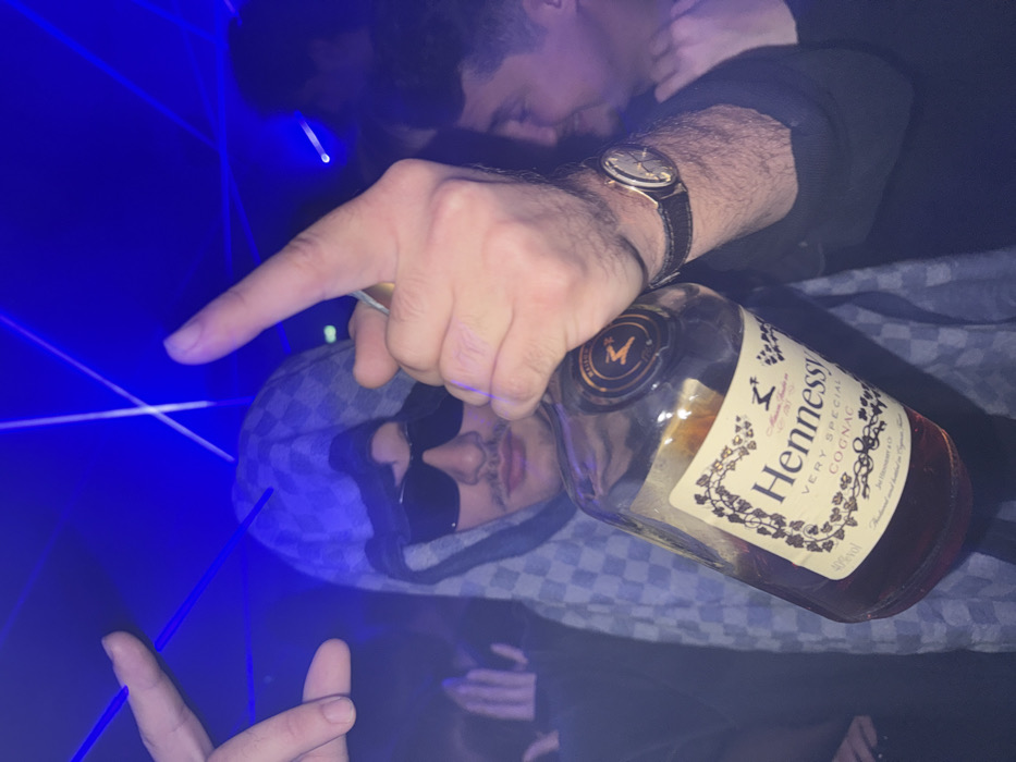 A man in sunglasses and a gray checkered hoodie is partially visible, overlaid with a transparent bottle of Hennessy Very Special cognac. Another person leans in from above. A hand with a watch on the wrist points towards the man in the hoodie, and another hand is visible making a peace sign. Blue light patterns illuminate the scene in the background.