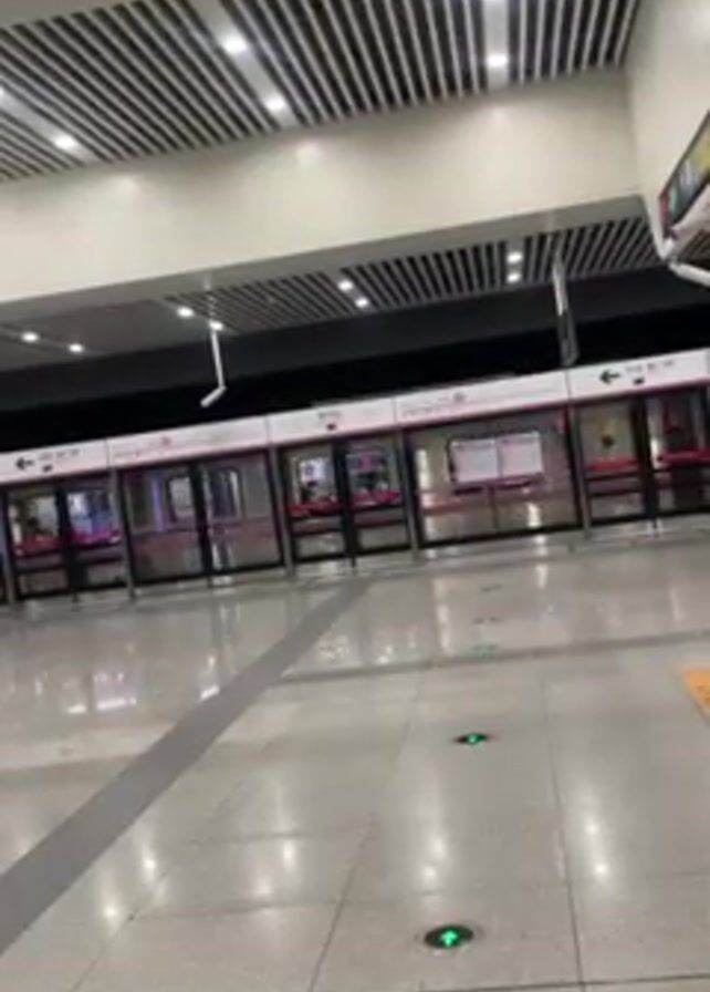 subway station platform. The platform is clean and modern, with a light gray tiled floor and a white ceiling with parallel black strips. There are platform screen doors separating the platform from the subway tracks. The doors are mostly closed, but a few people can be seen standing inside the train behind the doors. Green circular lights are embedded in the floor, and arrows point in different directions. An announcement is heard over the speakers, followed by the sound of the subway train.