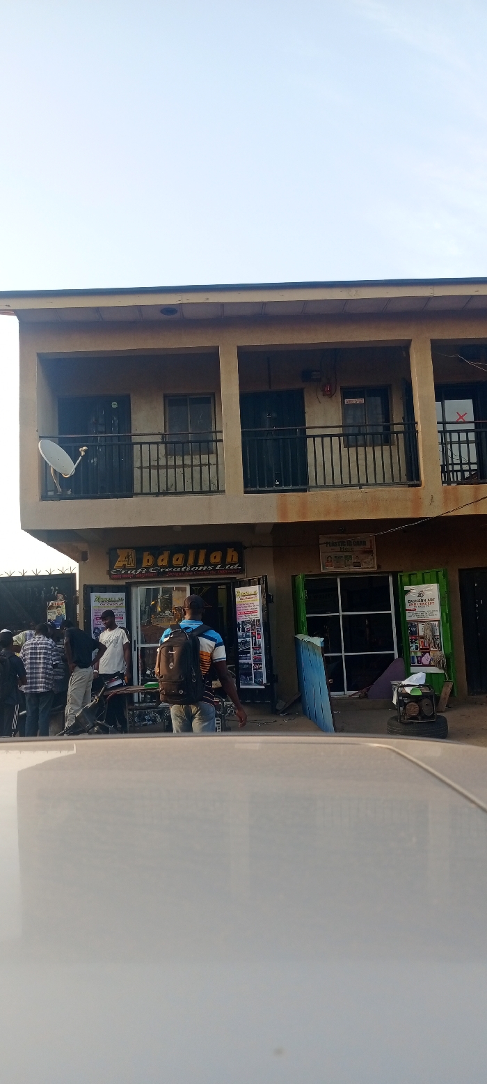 This image depicts a street scene in Dadi Riba, Nigeria, centered on a two-story commercial building under a clear sky