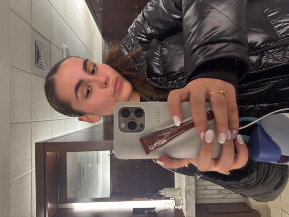 A woman in a black puffer jacket poses in a bathroom mirror