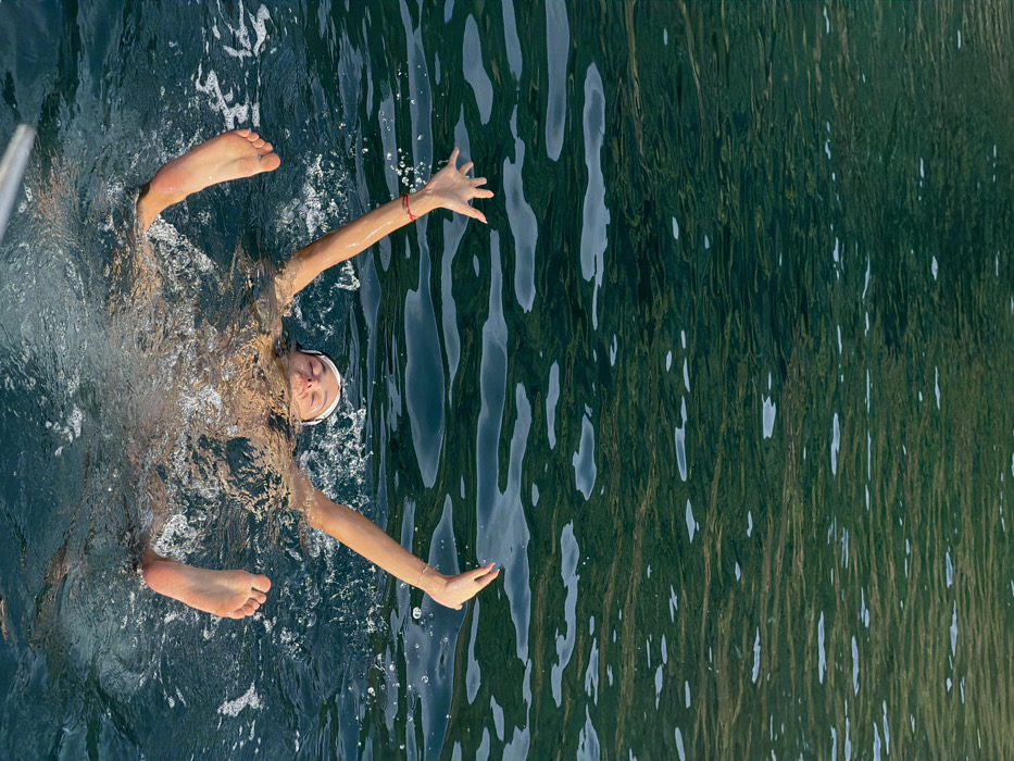 A young individual is depicted floating supine in deep, dark green water within the city of Rawai, Thailand