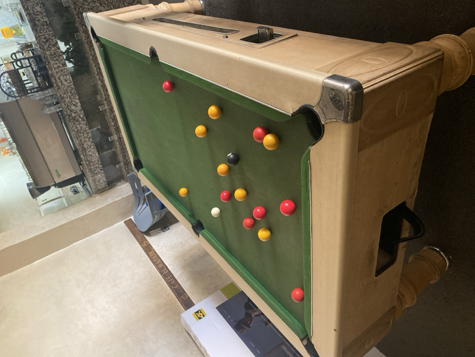 A vintage billiard table with green felt occupies the frame. Red, yellow, white, and black billiard balls are scattered across the surface. The table's wooden frame is light beige with ornate detailing and metallic corner accents. A stick rests on the ground next to the table. A partially visible white box sits underneath. The background shows a section of a room with light-colored walls and a glimpse of objects in the distance.