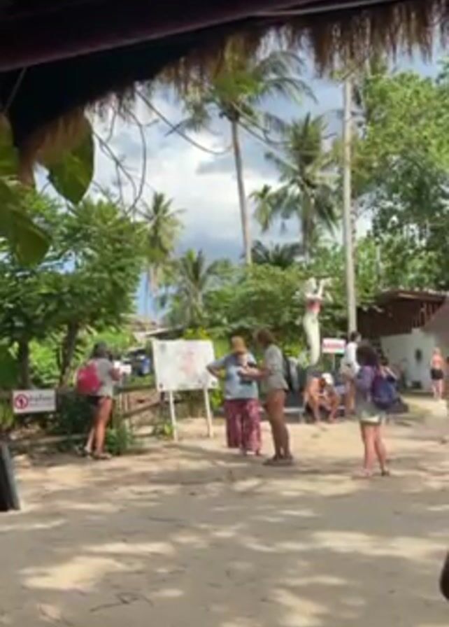 group of people gathered around a map on a board in an outdoor setting. Palm trees and other greenery surround the area, and a mermaid statue is visible in the background. The ground appears to be sandy. A few people are looking at the map, while others are standing nearby or walking past. The scene is viewed from under a thatched roof structure, which partially obscures the top of the frame. The overall impression is that of a tropical or beach location.