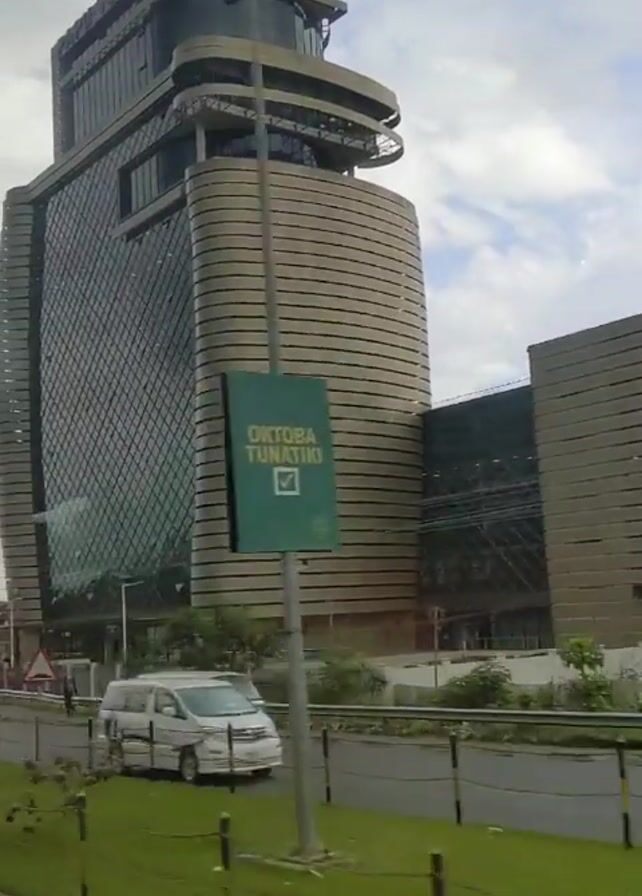 tall building in what appears to be a city. The building has a modern architectural design with a combination of glass and horizontal paneling. The glass section features a diamond-shaped grid pattern. There are vehicles on the road in front of the building, including cars, vans, and trucks. Pedestrians can be seen walking on the sidewalk. A street sign indicating directions is also visible. The sky is overcast with clouds. The camera seems to be moving, possibly from a passing vehicle.
