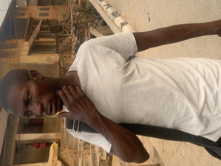A slender man in a light gray T-shirt stands in a vertical orientation. His left hand is raised near his chin, fingers lightly touching his face. A black strap, possibly for a bag, runs across his shoulder. The background shows a weathered, multi-level building, constructed with rough-hewn materials. To the right, a pavement-like surface is visible. The overall image appears to be taken in an urban area, with signs of age and wear in the surroundings.