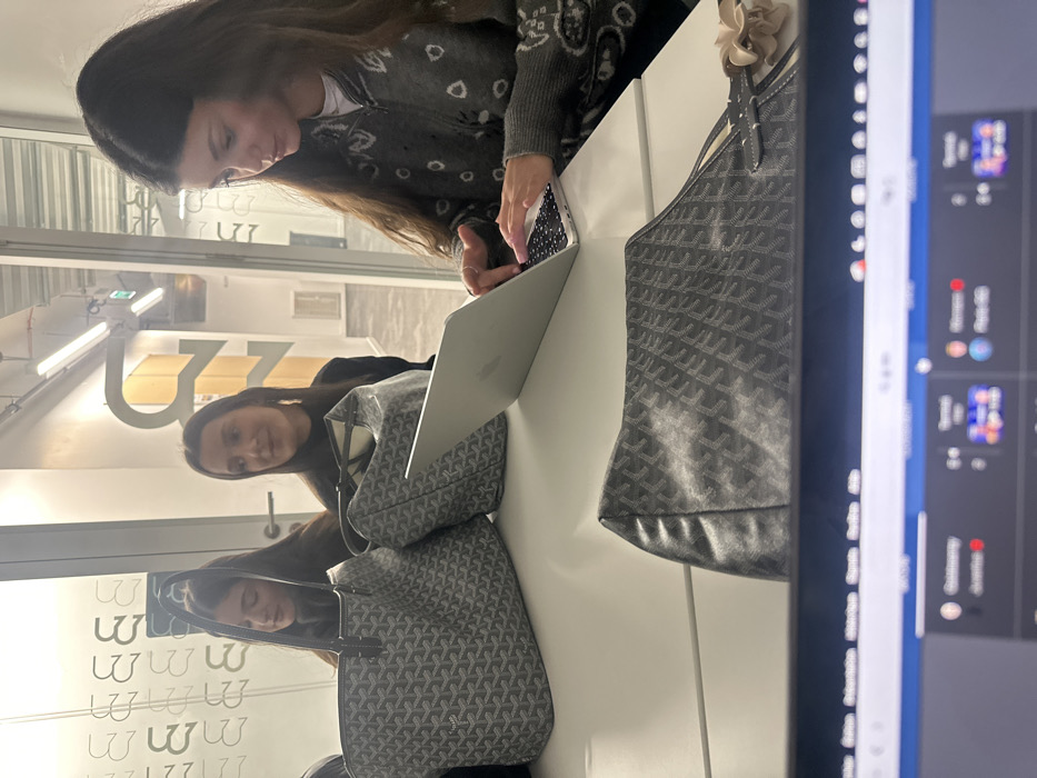 Three young women are seated at a white table within a modern, brightly lit co-working or office space, identified as the U2Z zone within Station F, located in the 13th arrondissement of Paris, France. On the right, a woman with long brown hair, wearing a grey patterned cardigan over a white top, is actively typing on an open silver laptop. To her left, another woman with long dark hair, dressed in a dark top, looks towards the right. A third woman, partially visible and reflected in a glass partition on the far left, looks downwards. On the white table surface, two large grey Goyard-style tote bags with a distinctive chevron pattern are placed next to the women. A smaller, matching clutch-like bag with a light beige floral embellishment is positioned in the foreground. In the immediate foreground, a separate laptop screen displays a user interface, likely for a messaging or gaming application, featuring profiles, numeric scores (e.g., "0-0"), and text including "Paris GG". The environment consists of glass partitions, one etched with a repeating stylized 'M' pattern. Beyond these partitions, a hallway is visible with a large, stylized 'U2Z' graphic prominently displayed on a wall. The space is illuminated by overhead fluorescent strip lighting.