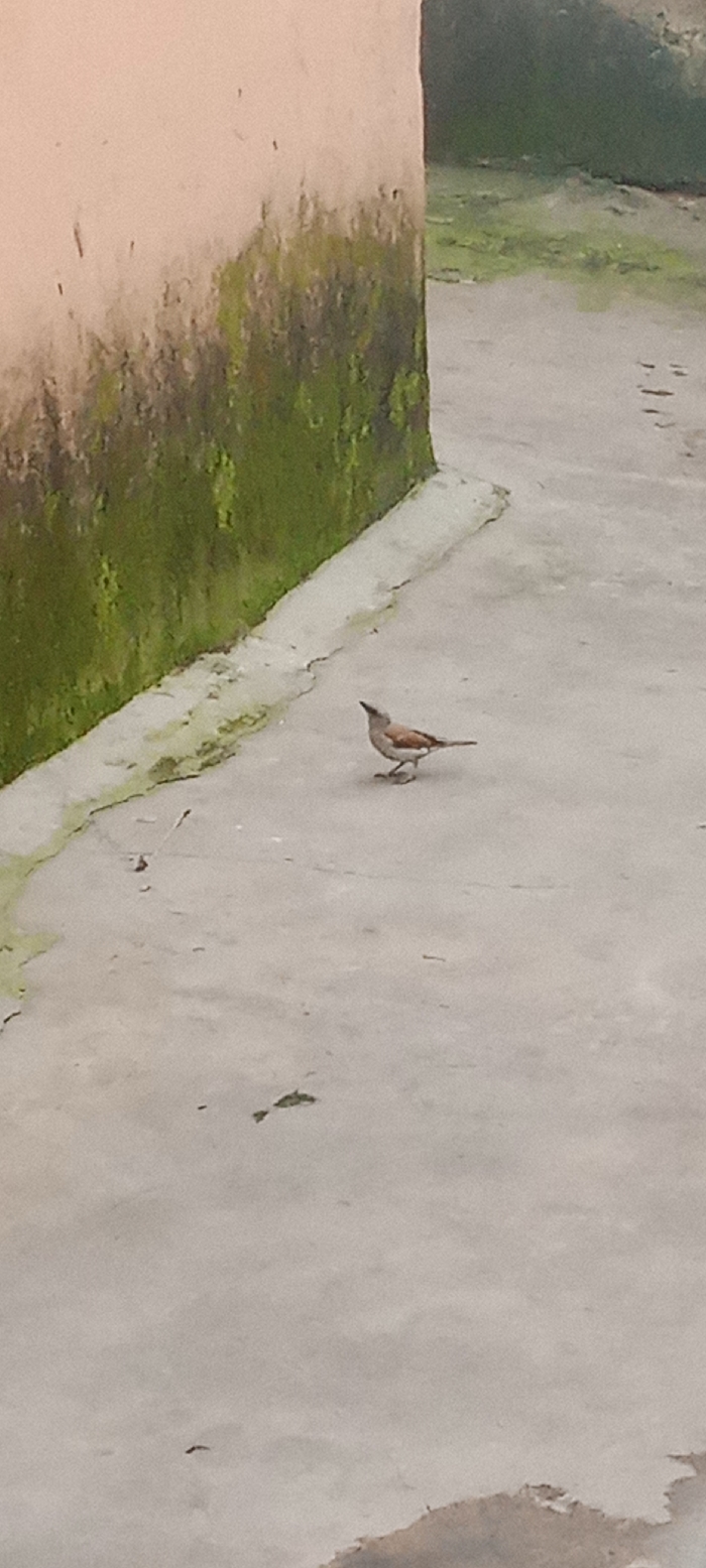 This image depicts an outdoor scene in Kwamba, Nigeria. A small bird, characterized by light brown and grey plumage with a lighter underside, stands on a light grey concrete or paved surface. Its head is tilted upwards, facing towards the left side of the frame. To the left, a light-colored wall, possibly peach or pale orange, runs diagonally into the background. The lower section of this wall exhibits significant growth of green moss or algae. A faint, thin line of lighter material, possibly dried residue or a slight elevation, separates the mossy wall base from the paved ground. In the background, beyond the wall, additional patches of sparse green vegetation are visible on a darker, possibly damp, ground surface. The environment appears to be an open, possibly neglected, area. No other individuals or active interactions are visible.