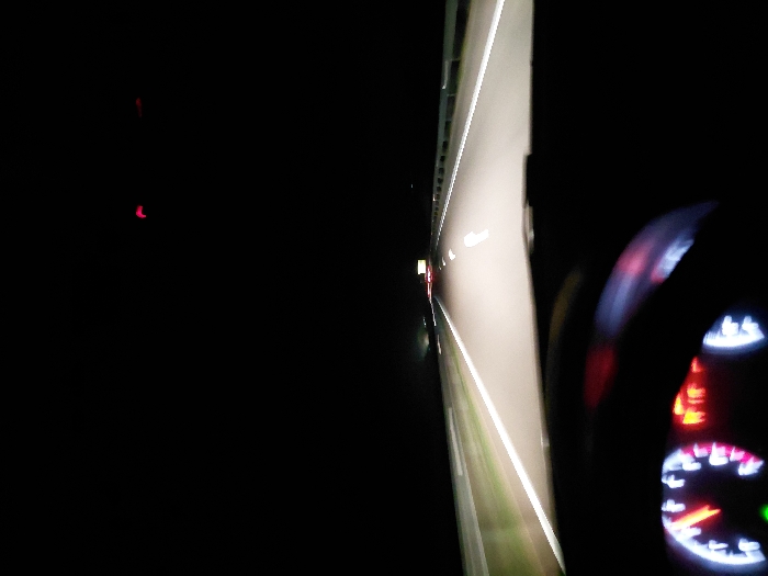 A nighttime view from inside a car driving on a highway. The road is illuminated by headlights, and white lines mark the lanes. A dashboard with gauges, partially visible, shows the car is in motion. Red lights are also apparent on the dash. The surrounding environment is dark, and there is an unfocused blob of red light in the distance.